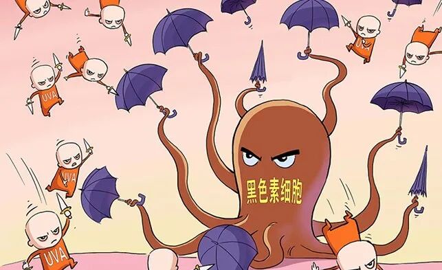 表皮基底层的“原住民”——黑色素细胞看到紫外线大军入侵,迅速用黑色素撑起一把把“保护伞”。但受路过的 UVA 刺激,“保护伞”越来越多,有的甚至飘到表皮最外侧,形成斑点。
