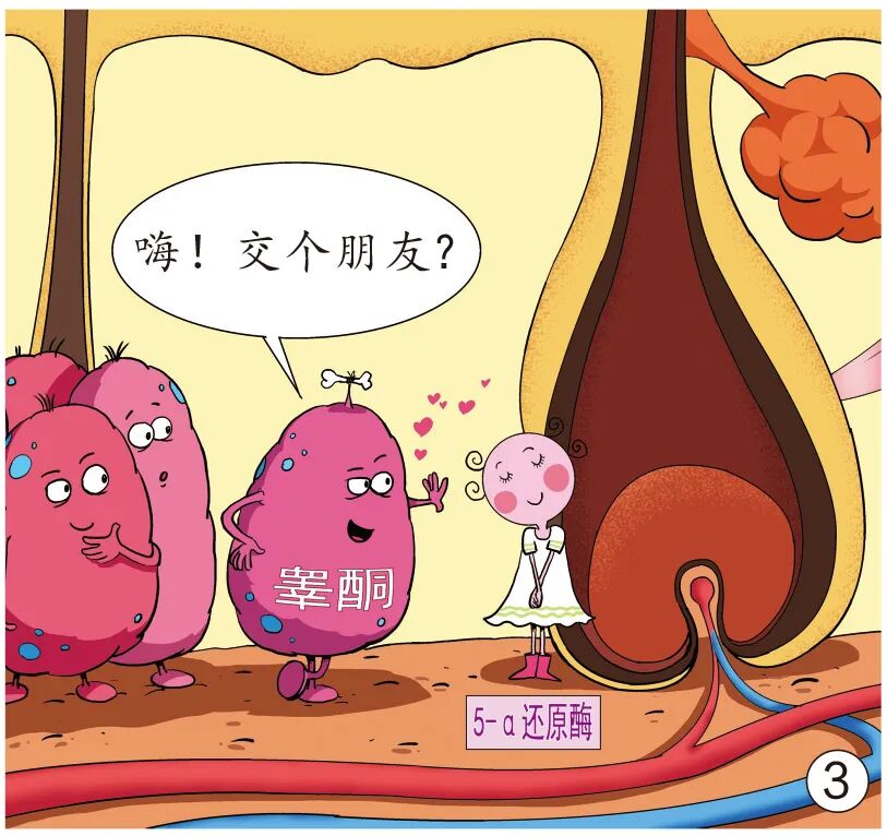 如果体内睾酮分泌过多,成群的睾酮就会被毛囊根部的5-α还原酶深深吸引,转化为双氢睾酮。这种产物能让毛囊微小化,毛发自然就变细软了。