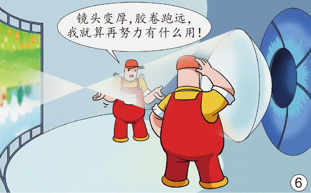 看向远处时,镜头和眼轴一时半会儿不能恢复原状,焦点就会落在胶卷底片的前方,造成视物不清。