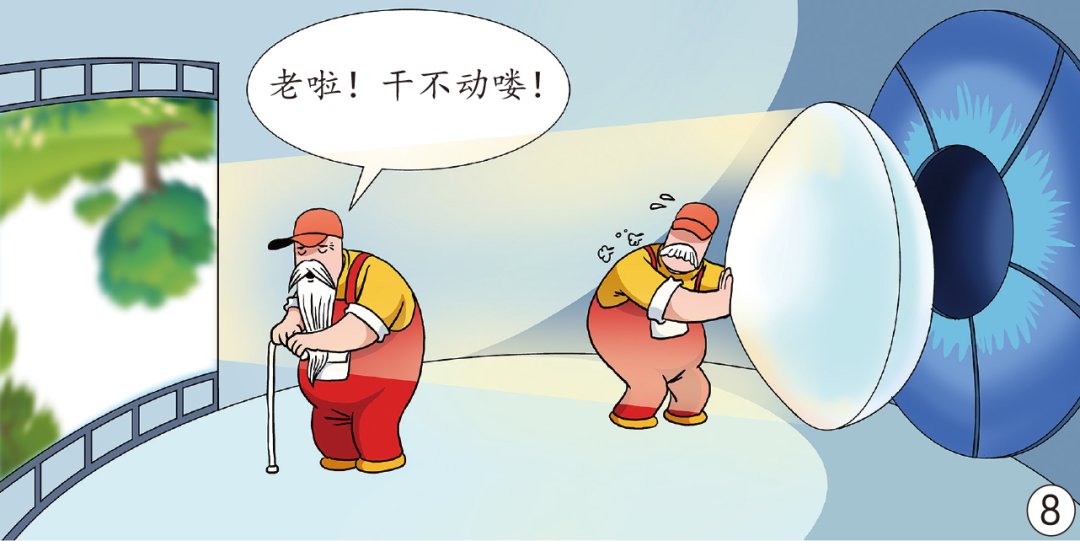 看近处目标时,光线距离眼睛较近,呈散发状态,需要调节工——睫状肌上岗工作。睫状肌用力收缩,一边挤压镜头,使镜头变凸;一边把巩膜往后拉,使眼轴变长,最终使焦点重新落在胶卷底片。