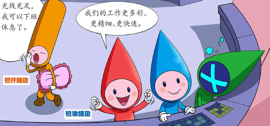 人的视网膜黄斑区上有视杆细胞和视锥细胞两种光感受器。视杆细胞负责在昏暗中感受光刺激,但只能呈现黑白画面;光线充足时,视锥细胞可以感知颜色。