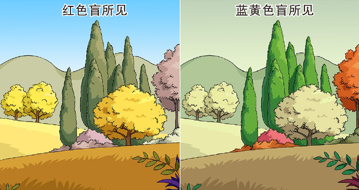 蓝黄色盲不能分辨蓝色和黄色等,看东西仿佛加了一层绿粉色调的滤镜;