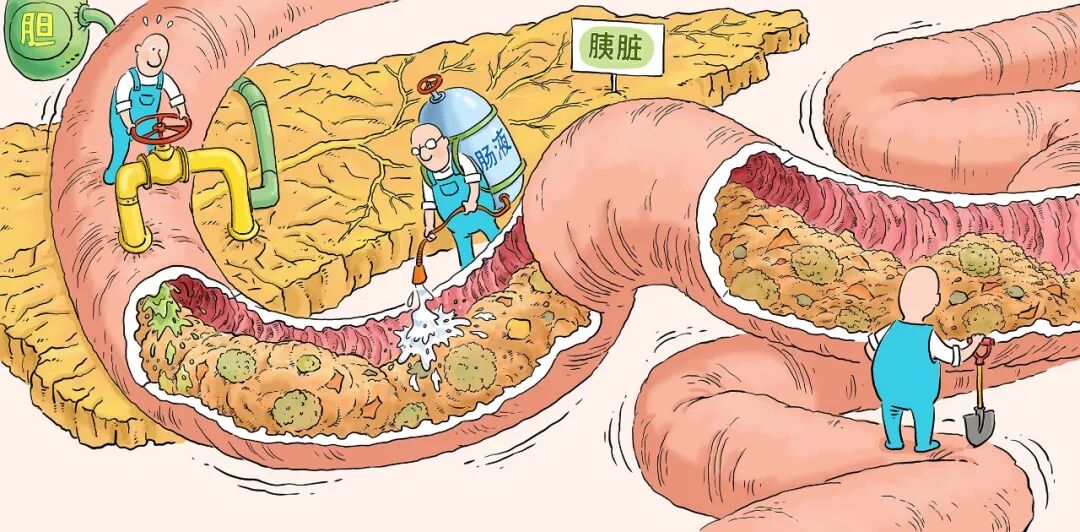 小肠里等候已久的三位“打工人”:胆汁、胰液和肠液,共同协作,将碳水化合物、蛋白质和脂肪分解成可供吸收的小分子物质。