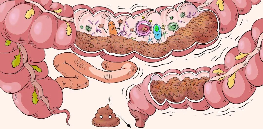 大肠内还“定居”了很多肠道菌群,它们会趁机汲取残渣中的剩余营养,肠道也会吸收残渣中的水分,最终把稀糊糊的残渣塑造成条状粪便,推向肛门,排出体外。
