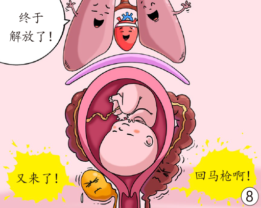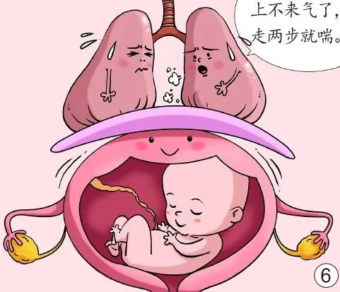 妊娠晚期,子宫已经将地盘向胸腔扩张,渐渐挤压横膈膜——负责在呼吸时扩张和收缩胸部的肌肉。被挤压的横膈膜少了“用武之地”,肺部的活动空间随之变小,孕妇呼吸变得困难。