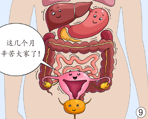 此时,膀胱和直肠的压力相对减少,症状有所缓解,但原本排列规整的小肠被子宫向上挤得“四散开来”,蠕动能力下降,胃则从原本的腹腔左上方“让位”到剑突附近,被挤扁甚至发生不同程度的扭转。