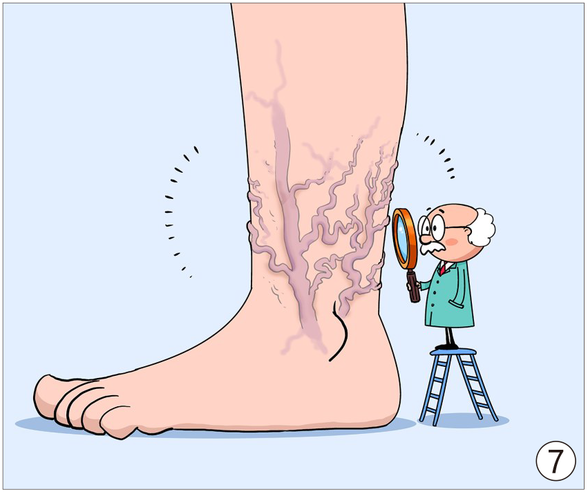 4.避免穿过紧的衣物及高跟鞋、不跷二郎腿、减少久坐或久站,高危人群每天睡前可将腿抬高一段时间。▲