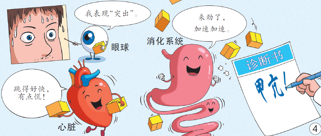 此时,人会表现出精神紧张焦虑、怕热多汗、眼球突出、心率快、多食易饥、肠蠕动加快等症状。