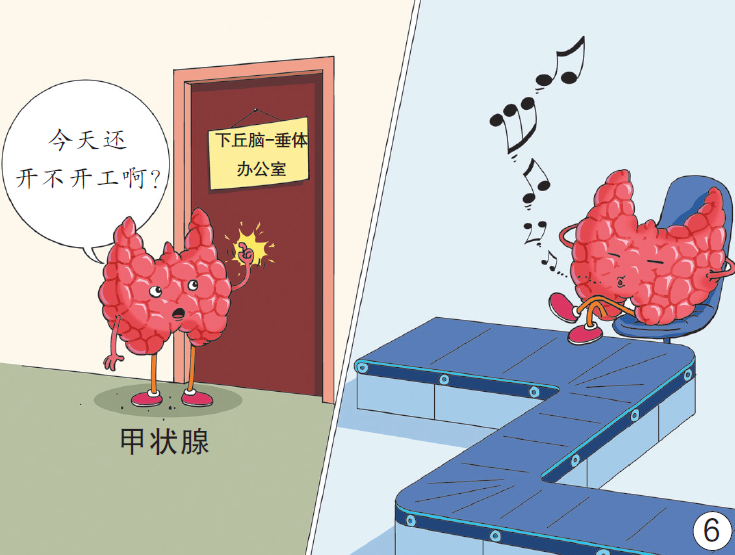 受刺激的甲状腺就会陷入“内卷”状态,不断分泌甲状腺激素,给其他同事加油鼓劲,导致同事们兴奋性增高、代谢亢进,引发甲亢。