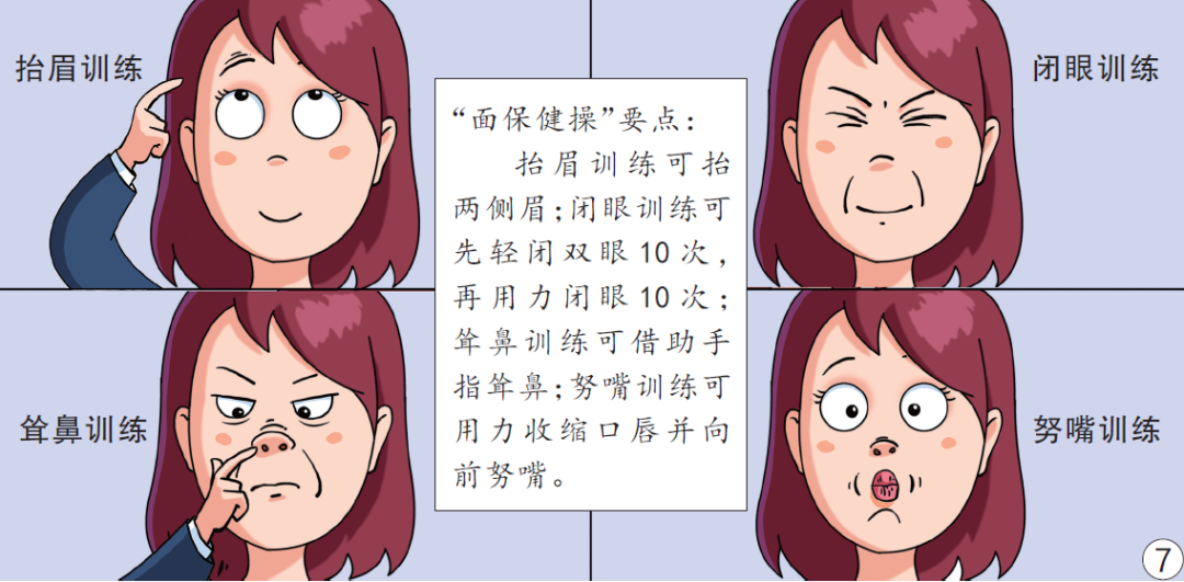 若想预防或延缓面肌萎缩可进行表情训练,做“面保健操”,具体可进行抬眉训练、闭眼训练、耸鼻训练和努嘴训练等。▲
