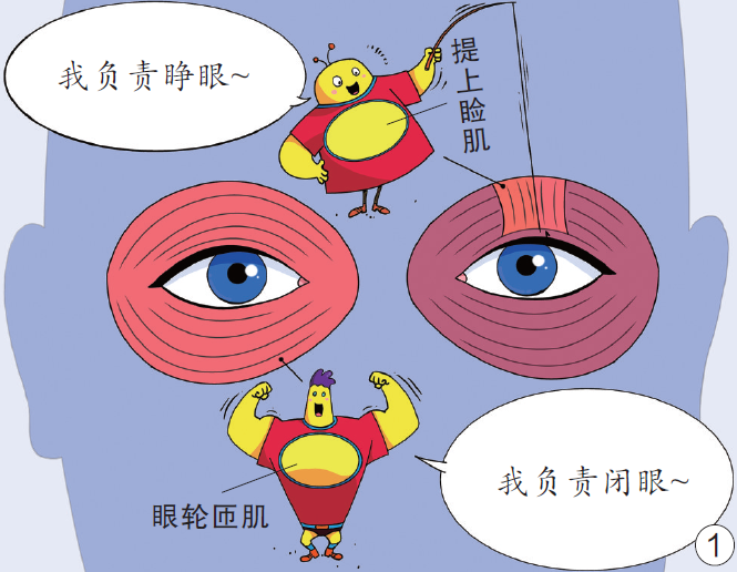 每个人的眼睑都有两种肌肉,一种叫“眼轮匝肌”,它像一个扁圆的车轮,当它收缩时,眼睛就会关闭;另一种叫“提上睑肌”,位于眼球上方,当它收缩时,眼睛就可睁开。