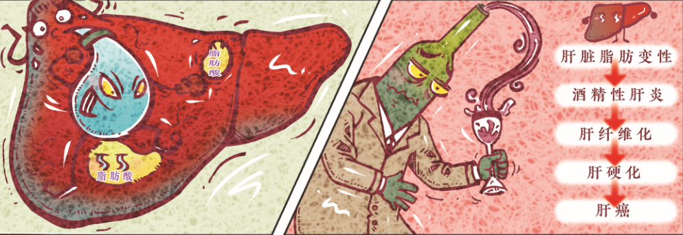 肝脏内,肝细胞正在分解脂肪酸。酒精进入后,妨碍肝细胞工作,渐渐引起肝内脂肪沉积。随着时间的累积,引发肝硬化等一系列病变。
