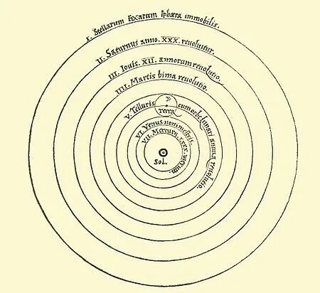 哥白尼说——错,地球不是宇宙的中心,太阳才是。整个宇宙是静止不动的,太阳在正中心,其他星球都围绕太阳匀速旋转着,包括地球。