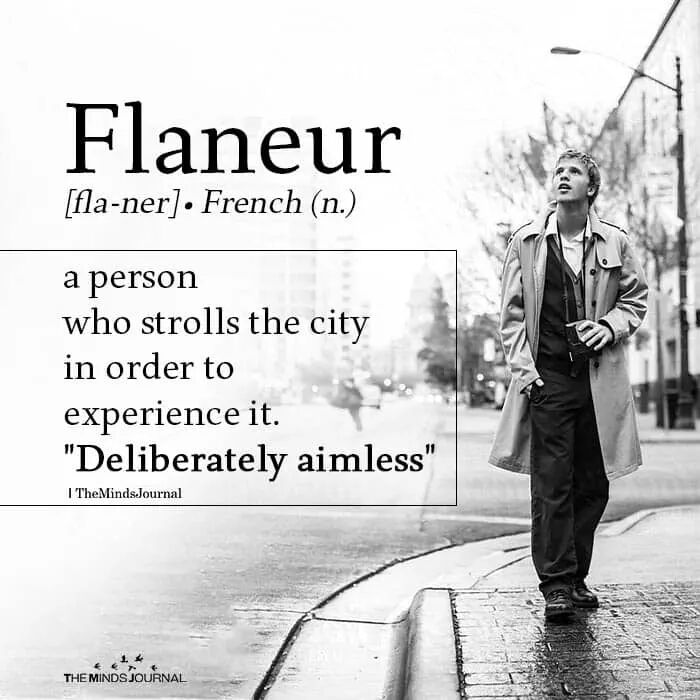 如果你完全无目的地在街头闲逛,心里不设目标,只是随便走走,随便看看,什么也不为,你就是一个 flaneur.