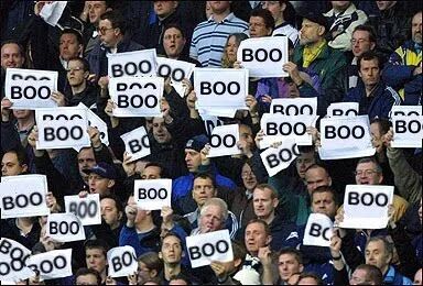英文中表示喝倒彩其实有很多说法,最常见的是boo(ing),一般翻译成“嘘声”。还有一个是thumbs down,就是拇指向下的手势。更多说法参见旧文 - 第232期:ovation
