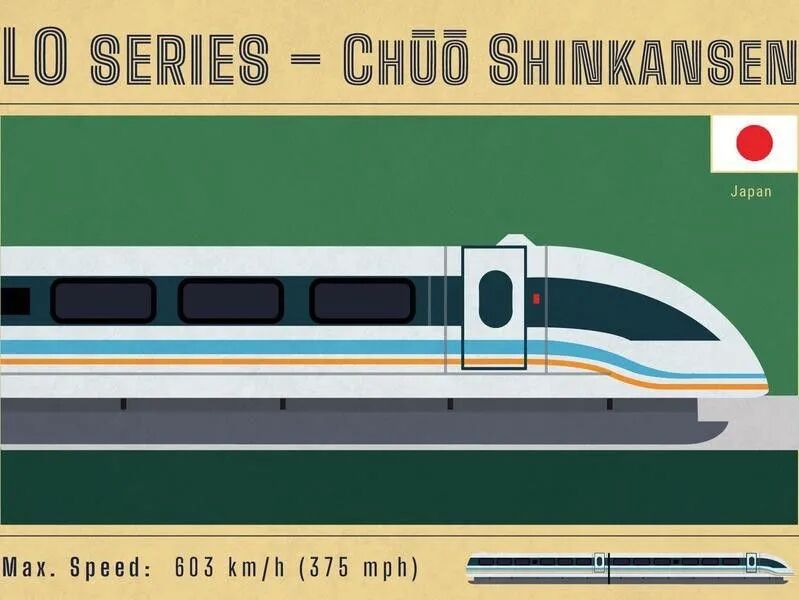 Japan's high-speed train Shinkansen(新幹線) broke the world speed record for rail vehicles with a maximum speed of 603km/h (or 375mph), becoming the world's fastest train.