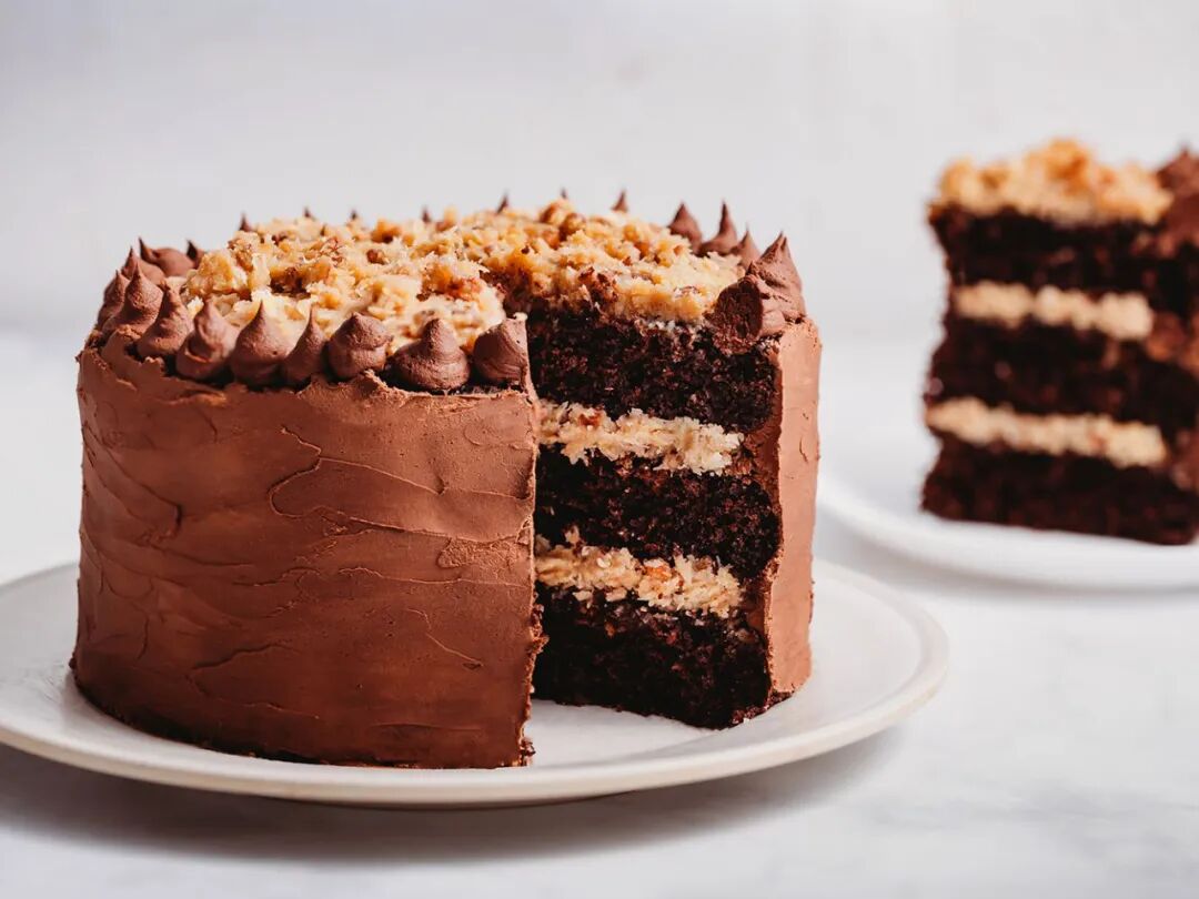 German chocolate cake is a layered chocolate cake filled and topped with a coconut-pecan frosting.