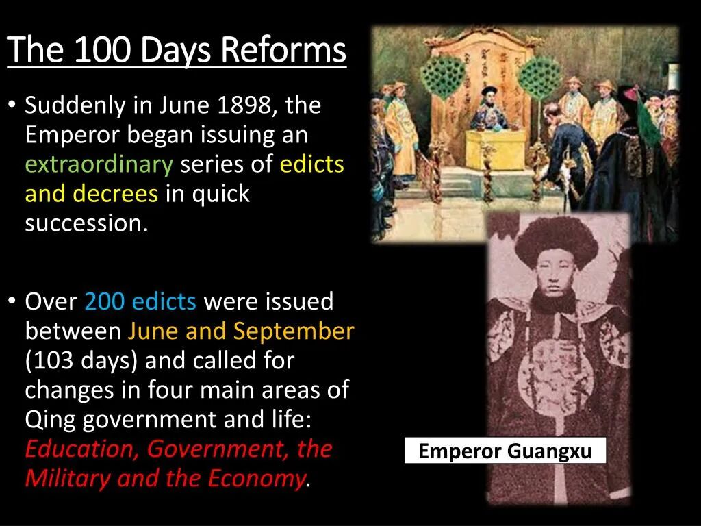 Emperor Guangxu of China’s Qing Dynasty initiated The Hundred Days' Reform or Wuxu Reform (from 11 June to 22 September 1898) *百日维新、戊戌变法。The attempt failed after 103 days in The Coup of 1898 perpetrated by the powerful conservative opponents led by Empress Dowager Cixi.