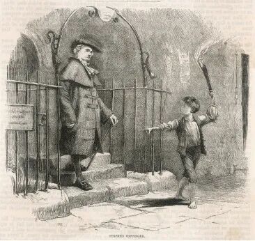 据说这是19世纪之前英国常见的场景,路灯和煤油灯还没发明,有钱人如果天黑了出门,就需要一个仆人在前面举着火把给他照明看路。