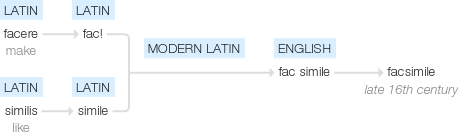 Fax 传真,完整写法是facsimile (/fakˈsiməlē/),源自拉丁语fac! (‘make’) + simile (‘like’),字面意思是“制作一份一样的”.