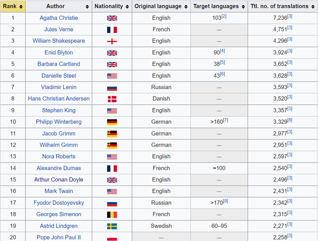 昨天我在写安徒生那篇文章时得知他在“全世界被翻译得最多的作家“(the World’s most translated authors) 榜上排第8名,于是好奇排在他前面的那七位是谁。