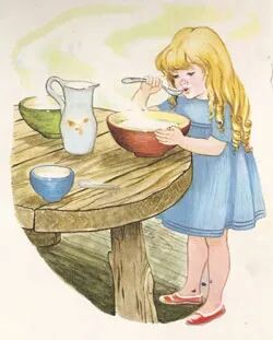 有一天,三头熊做好了饭,把粥盛到了每个碗里。但是粥太烫,不能马上吃,于是三头熊就出去玩,等粥凉一下再回来吃饭。