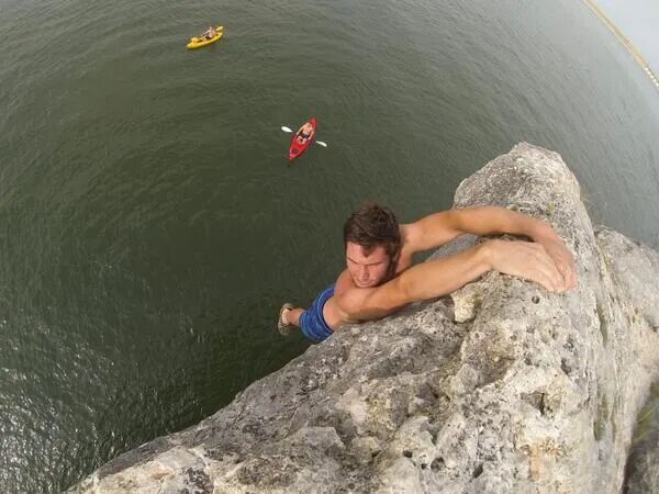 The stranded hiker was hanging on by her fingernails until the rescue crew arrived.