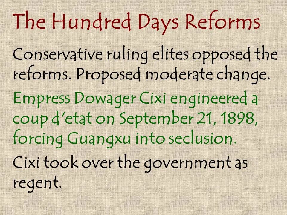 ongoing reforms, ending "The Hundred Days' Reform" (or Wuxu Reform.)