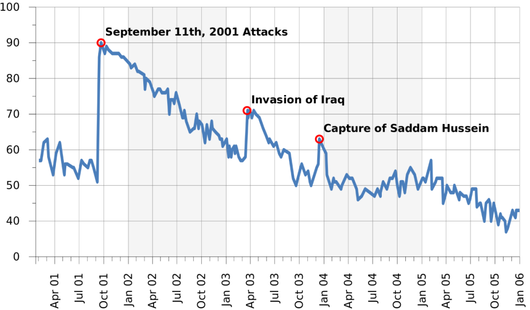 2001年美国总统小布什(George W. Bush)的民调支持率最低跌至51%,结果9/11恐袭事件一发生,他的支持率迅速飙升,最高升至90%.
