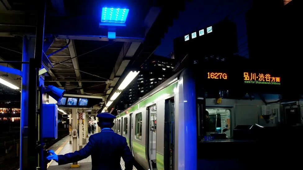 据说为了降低火车站自杀率,日本铁路公司从十年前开始在东京地铁站的沿线主要站台设置蓝色照明灯光。