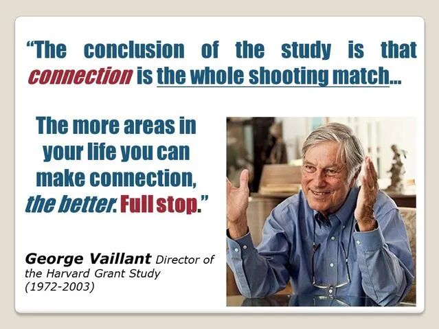 实验者追踪研究了这些人一生中各个阶段的健康状况、事业成功与挫败、婚姻状况等各个方面,结果远远超出了实验设计者最初的想象——在所有人生变量和因素中,对人一生的健康和快乐影响最大的不是财富,也不是事业的成功,而是——relationship.