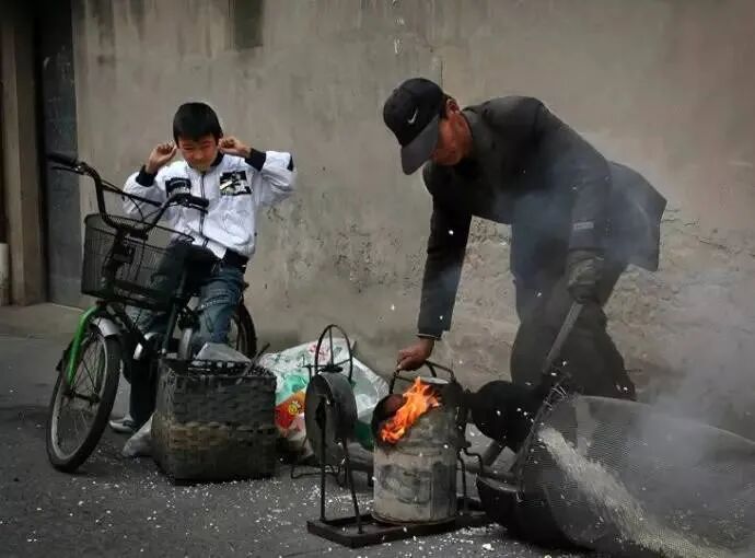 一个老头,从一辆破架子车上卸下一个炸弹形状的黑色生铁容器,架在炉子上加热,炉子里是烧红的炭,火苗冲天。他摇着那个铁疙瘩在那儿转啊转,大人小孩都围着看,垂涎三尺。不到十分钟,他把那个容器一手拎起来,大人小孩连忙往后退,捂起耳朵。老头把炉子往地上一架,一头套上一只长布口袋,嘭的一声巨响,没崩进口袋的爆米花散落一地。