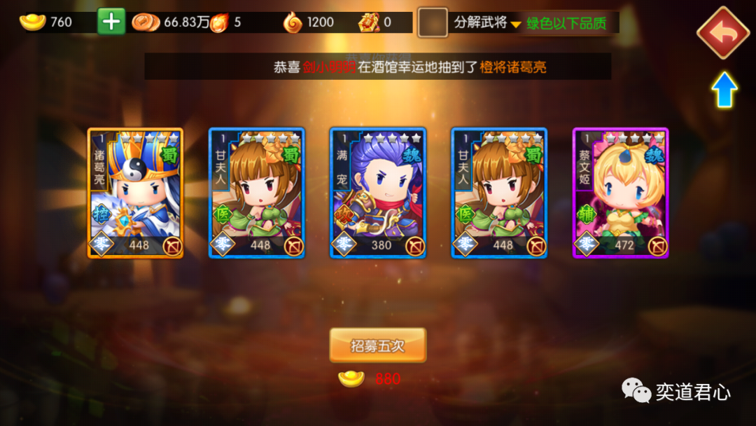 【萌军天下】的武将造型跟大街上的路人NPC差不多,怎么可爱就怎么整。他们的抽取主要通过酒馆,普通武将用铜板,名将级别用元宝,每逢特殊节日还有专属活动。对于那些追求慢节奏休闲放松的朋友们来说,这款手游还是比较友好的,起码我第一天来玩就入手了诸葛亮。接下来的趣味玩法我也会慢慢探索,并在后续的文章里分享,谢谢大家的关注和支持。想要一起来体验游玩的朋友,可以点击下方的【阅读原文】下载哦!