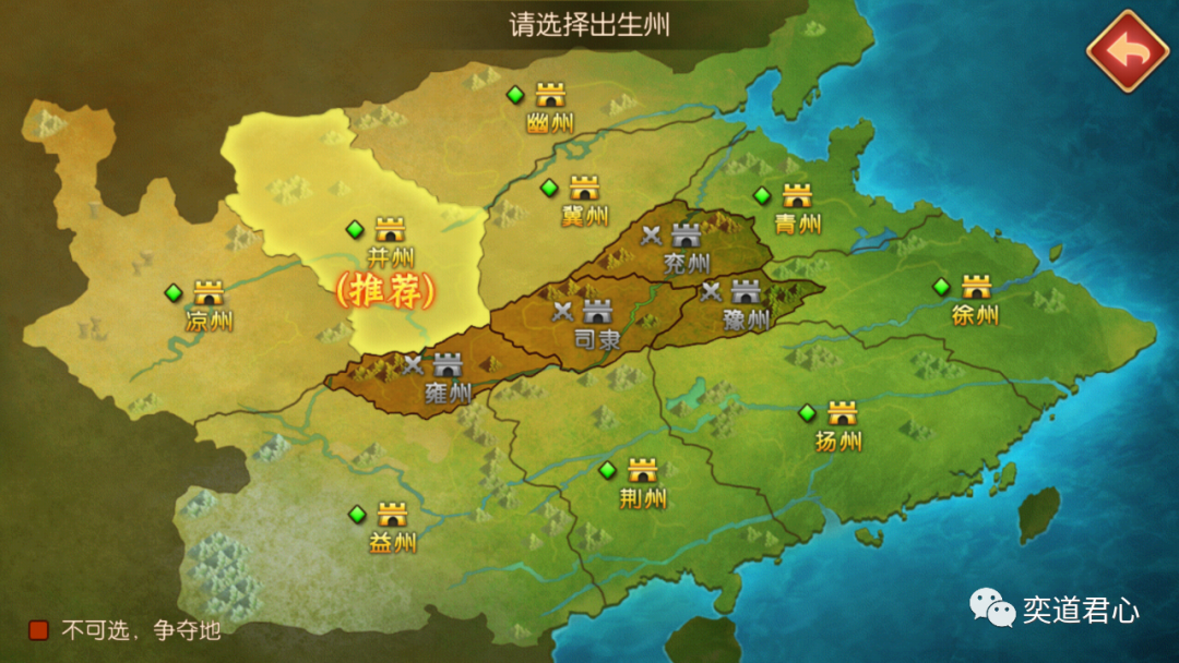 初来乍到【萌军天下】的世界,从起名字到选择出生地,一切都是比较常规的习惯性操作。不过需要我们注意的是,天下十三州的兖州、豫州、司隶、雍州不可以选择,这四个地区被作为另外九州的争夺地块,在归属上是不稳定的。除此之外,幽州、冀州、青州、徐州、扬州、荆州、益州、凉州、并州这九个片区就能自由选择,虽然系统推荐让我选并州,可我好歹家住在零陵一带,还是果断选择了荆州。