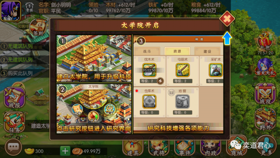 内城一片岁月静好,有背着货架四处摆摊的小贩;有摇着八卦算命占卜的道人;还有撑着太阳伞在大街上闲逛的小姐姐。对于之前玩过同类SLG手游的玩家朋友们来说,民房、农场、林地、矿场的功能早就滚瓜烂熟,没有太多赘述的必要,仅次于主体太守府的功能建筑应该是太学院。【萌军天下】游戏里的太学院,是我们整座城的科技研发中心,战斗、资源、建设领域的技术都要通过太学院来进行研究点亮和进一步的升级。