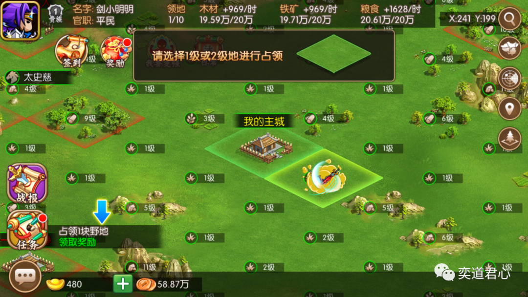 咱们驻扎的城市从外观看上去就跟游乐场里的小城堡似的,附近周围的地块按照资源点的攻克难度从1到10级都有分布。土地属性主要分为空地、农田、矿石、木材,我们想要攻打更肥沃的地皮也同样需要先把铺路工程做好。随着主城等级的提升,就可以占领更多数量的领地,直到吃掉自己的邻居。