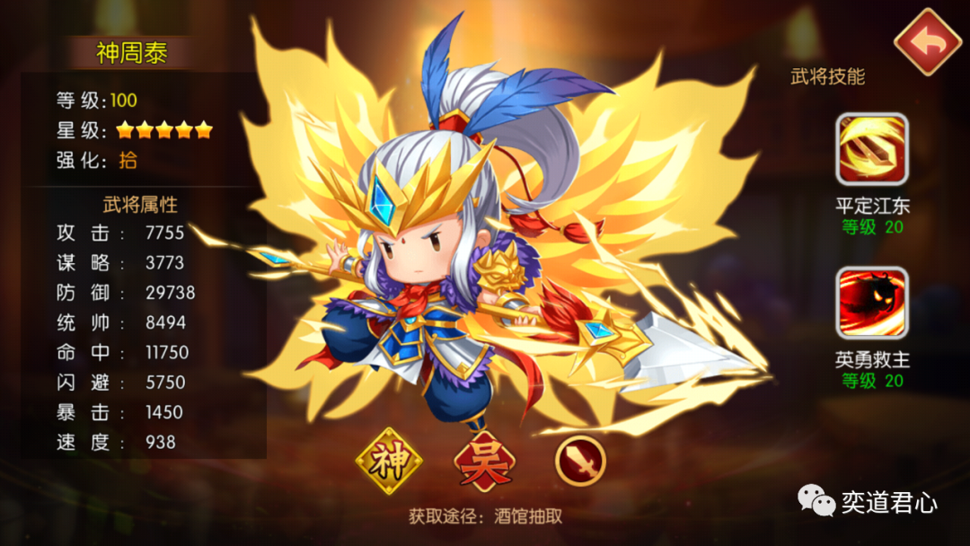 先让我们看看神周泰,他作为孙权身边最忠心的铁卫,就等同曹操身边的许褚那样,肉盾属性必须爆表。首技能平定江东是个满屏群攻大招,并清除目标所有的增益效果,二技能英勇救主则为全队翻倍增加防御,并持续4个回合免遭敌人封普攻,是全队攻防状态的稳定器。