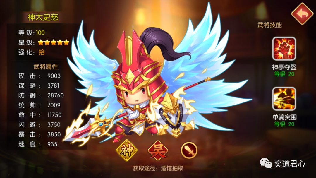 神太史慈的第一个技能,跟孙策有直接的关系。他还在刘繇帐下的时候跟孙策狠狠干了一架,双方在神亭岭战了个平手,在战斗中夺下了小霸王的头盔,故而【萌军天下】给神太史慈发了个“神亭夺盔”。此技能的发动概率是100%,让神太史慈的暴击翻倍并带有普攻溅射效果,一刀下去左右皆伤。单骑突围则更进一步提升神太史慈的输出,而且进入免疫封禁状态,无人可以限制其普攻。