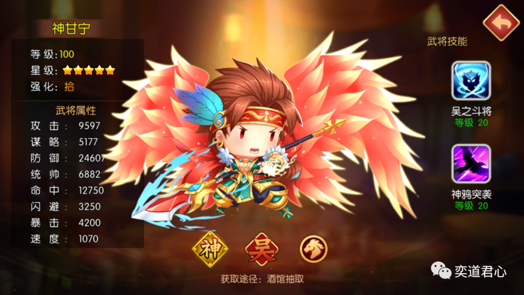 默认携带骑兵的神甘宁,是三人之中速度最快和暴击最高的,百骑劫营的战绩至今都广为传颂。吴之斗将在战斗开始的第1回合必定触发,全面提升全队所有成员的攻击、命中和闪避,而且免疫眩晕和流血这两个负面效果的影响。神鸦突袭100%能把敌方部队的其中2人眩晕,虽然神甘宁的定位是攻击,却也不比职业的控制单位逊色。