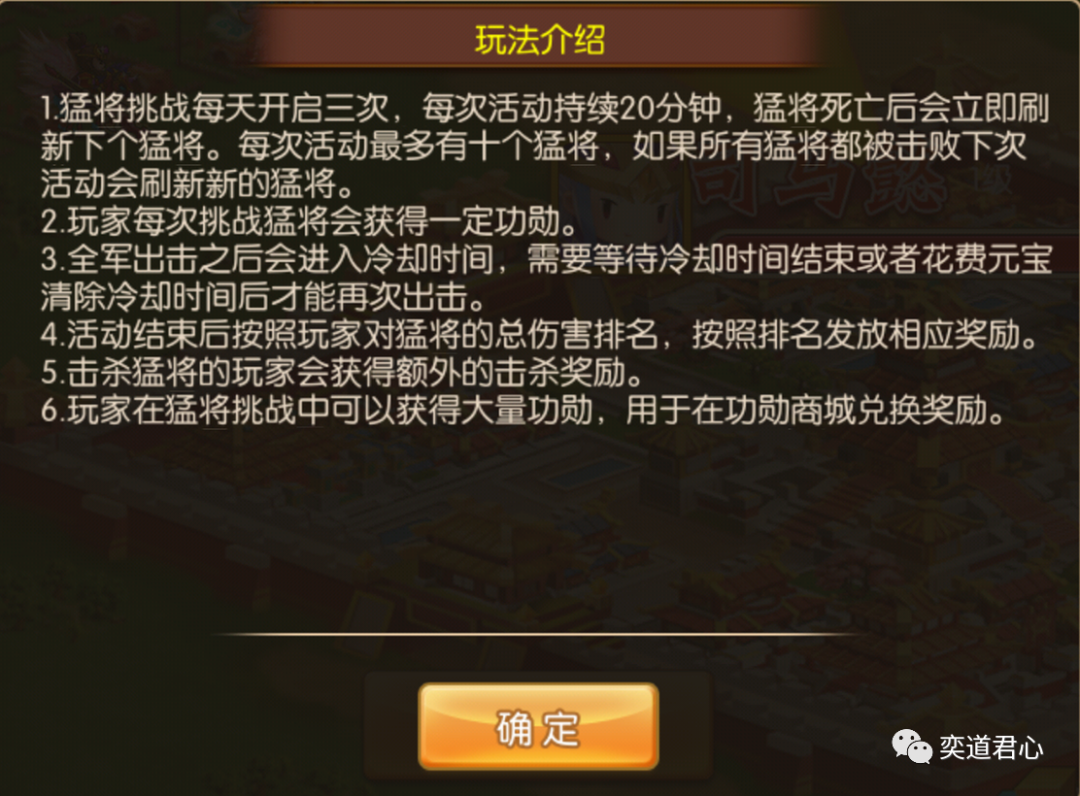 当然普通平民玩家去单挑猛将的结果是可想而知的,才来新区开荒几天的小朋友,怎么可能打得过系统光环支撑的大BOSS呢。车轮战积累的总伤害,才是真正衡量获得功勋多少的核心指标。建议各位加入一个活跃的同盟,每次猛将挑战活动就会有很多厉害的高手带你蹭功勋了,就算自己处于全军躺平的冷却时间,也还是会有其他盟友前赴后继的不间断输出。活动结束之后,就会按照对猛将的总伤害进行排名,并且按照排名来发放相应的奖励。