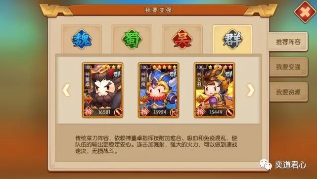 神董卓+神颜良+神文丑这个组合,被【萌军天下】评为最传统的菜刀阵容,其中的神董卓既是主帅又是肉盾,神颜良和神文丑则在战斗时负责收割人头。一个坦克搭配两个打手,竟然胆子肥到连治疗都不带,想必他们也是做足了准备吧。