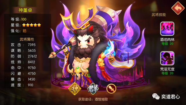 董太师执掌朝政的时候,连曹老板都只能夹起尾巴做小弟,真要说起实力,董卓肯定是不差的。【萌军天下】手游里的董卓,依旧是那个大家熟悉的超级肉坦克,神董卓更是把防御凸显到了极致。酒池肉林技能在战斗开始的第2回合必定触发,令我方全体成员在接下来的4个回合受伤减半。荒淫无度技能则早在第1回合就开启了,令我方全体成员获得治愈和普攻吸血状态,还能免疫敌人施加的混乱效果。