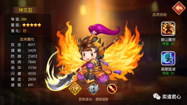 最后让我们来看看神文丑,默认携带的刀盾兵预示着他同时兼顾了菜刀和肉盾这两类属性。拔山盖世的施放概率是100%,在对敌方2人造成群攻伤害的同时,使神文丑自身进入普攻连击,遗憾没有溅射效果。高歌猛进才是神文丑的核心价值所在,战斗的第1回合就翻倍提升了他的攻击并免疫混乱,长达4个回合的暴走时间内,一般的对手早就被他剁死了。