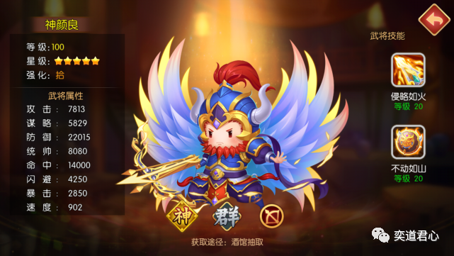 作为河北四庭柱的老大,神颜良在【萌军天下】的默认携带兵种是弓兵,意味着他并不适合冲在最前头,放在腰部承上启下为宜。神颜良的首技能侵略如火,在战斗一开始就能翻倍提升他本人的暴击,且普通攻击自带溅射伤害,在接下来的5个回合内还免疫敌方的封禁,菜刀一旦启动根本停不下来。不动如山的作用,是在大幅度削弱对方2人输出技能伤害的同时,再增加他们所受到的技能伤害,减攻增伤这两手的数据都很可观。