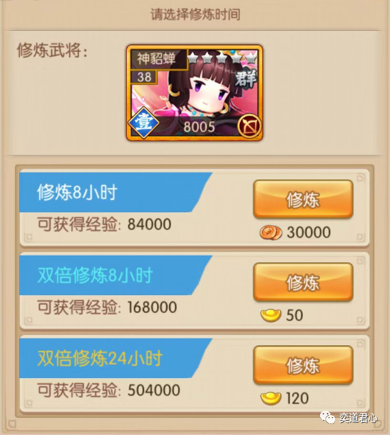 被放入修炼塔的武将并不会耽误野外出征,该出阵还是照样出阵,只不过有了修炼塔的经验叠加会使得武将的升级速度更快。【萌军天下】目前给武将单次修炼的时间分为三档,分别是普通修炼8小时(消耗铜钱);双倍修炼8小时(消耗少量元宝);双倍修炼24小时(消耗中量元宝)。玩家们可以根据自身的实际情况来决定武将单次的修炼时长,个人觉得还是双倍修炼24小时的综合性价比最高。