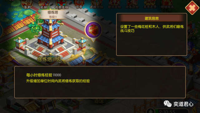 在每一个玩家的主城里,都会有一个特殊的功能建筑,就是上图的修炼塔。顾名思义,修炼塔存在的意义,就是为了让已经招募在编的武将可以快速提升等级和修为。修炼塔每提升一级,就能固定增加单位时间内武将修炼所获取到的经验值,具体的升级材料自然就是铜钱、粮食、石头、木材什么的,建议大家把提升修炼塔等级的事项放在优先地位。