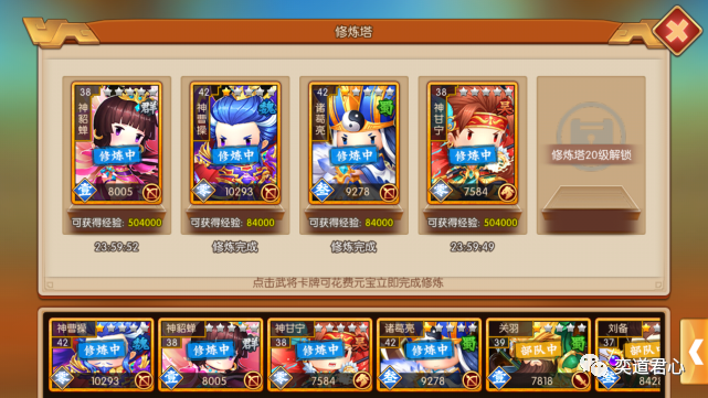 随着修炼塔等级的不断提升,所开放的修炼席位也会更多,到20级的时候就可以同时练5个将了。如果你觉得24小时太漫长,也可以直接使用更多的元宝来让他们立即出关,对于单纯追求休闲的平民玩家来说,其实放着也挺好。【萌军天下】赠送元宝的活动和趣味小游戏很多,如果你有比较充足的时间,多参与活动和进行小游戏也是可以快速获得不少元宝的,像曹操、诸葛亮这样特别强力的关键武将,的确值得狠狠砸一波。