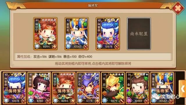 偏将军提升能力的幅度,明显全面高于都尉,所以选择提拔对象的时候一定要让最强的先上。诸葛亮、曹操、貂蝉、甘宁这类角色都有着非常实用的场控和群体增益能力,相比吕布、关羽这样的菜刀而言,他们对于整体战局的把控更值得信赖。由于越往上的拜将名额越少,特别需要注意给这些全局作用型的角色留位置。