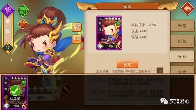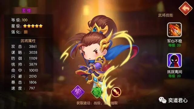 另一位双重国籍身份的姜维在游戏里的定位是攻击手,默认携带的刀盾兵比徐庶的弓兵队明显更能扛揍,不过他的作用侧重在了压制。军心不稳是个针对敌方单体猛攻的特技,还能削弱目标六成的防御力,为职业暴击菜刀选手关兴创造一击毙命的机会。挑拨离间也是个作用于单个敌人的技能,清除目标身上的所有增益效果(包括治疗),让对方的医疗和辅助型英雄彻底形同虚设。有了徐庶和姜维同时压阵,即便全部是紫将的阵容,也丝毫不惧极难险重的任务。