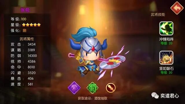 张苞这个小坦克尽管没有他爸爸的狂暴凶悍,却多了几分扎实稳重。冲锋陷阵猛攻敌方单体,同时最高提升自身145%的闪避率,这铁定是做前锋的料了。坚如磐石技能是张苞生命力续航的根本保证,翻倍增加防御并同时自动疗伤,就算对方是橙将都很难伤得着他。